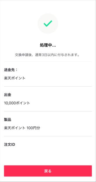 TikTokライトポイントを楽天ポイントへ直接交換するやり方4つ目が「交換完了」です。