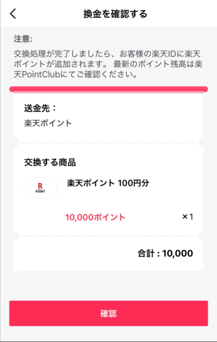 TikTokライトポイントを楽天ポイントへ直接交換するやり方3つ目が「換金を確認する」です。